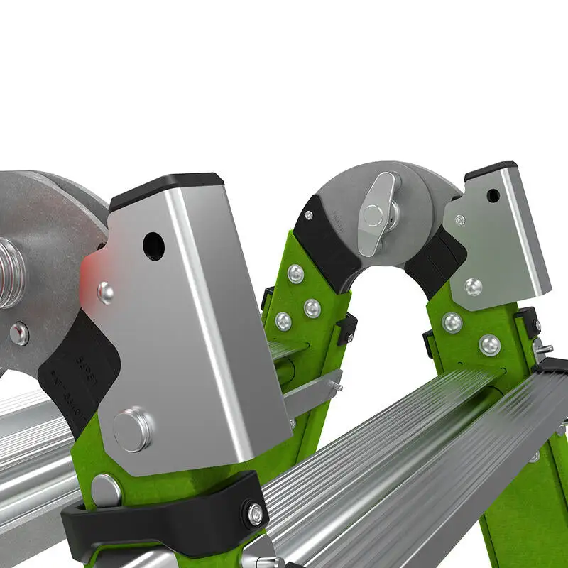 Move from storage to A-fram, extension and 90 degree configurations by pushing in the ladder's palm buttons.