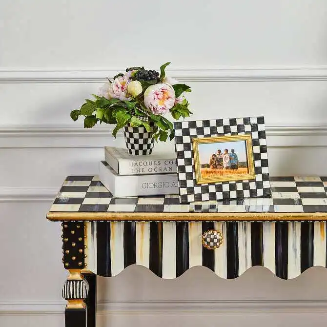 We've yet to find a photograph that doesn't look fabulous in a Courtly Check Frames. Pepper these into your family photo gallery or give one as a standout gift for a friend. Steel underbody with hand-painted Courtly Checks. Backing is black linen with a brass logo plate.