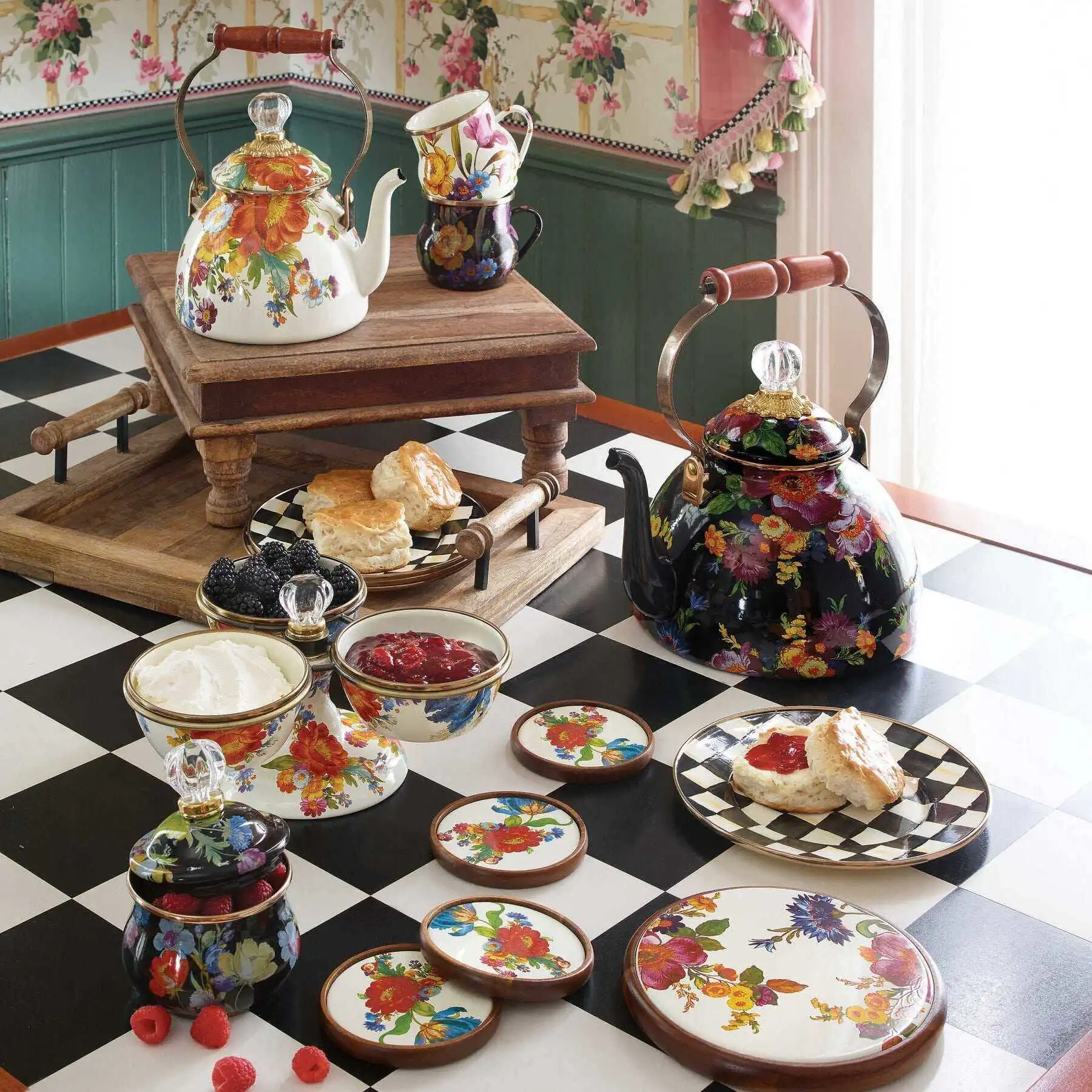 Bubbling over with MacKenzie-Childs style, the White Flower Market 2 Quart Tea Kettle will have you finding new reasons to put the kettle on to boil.