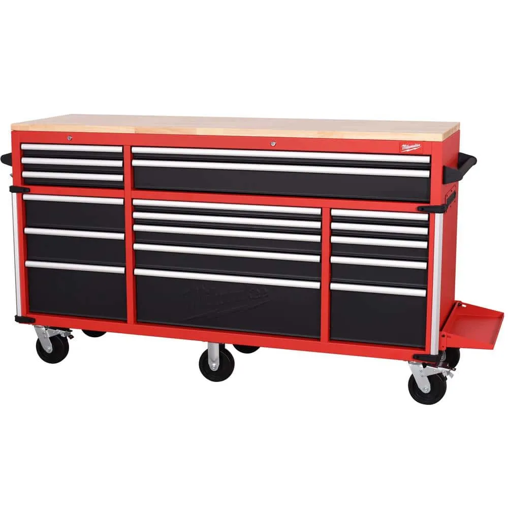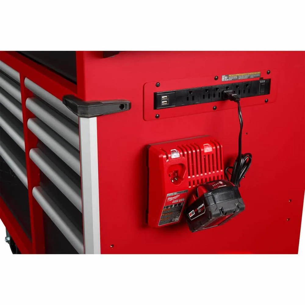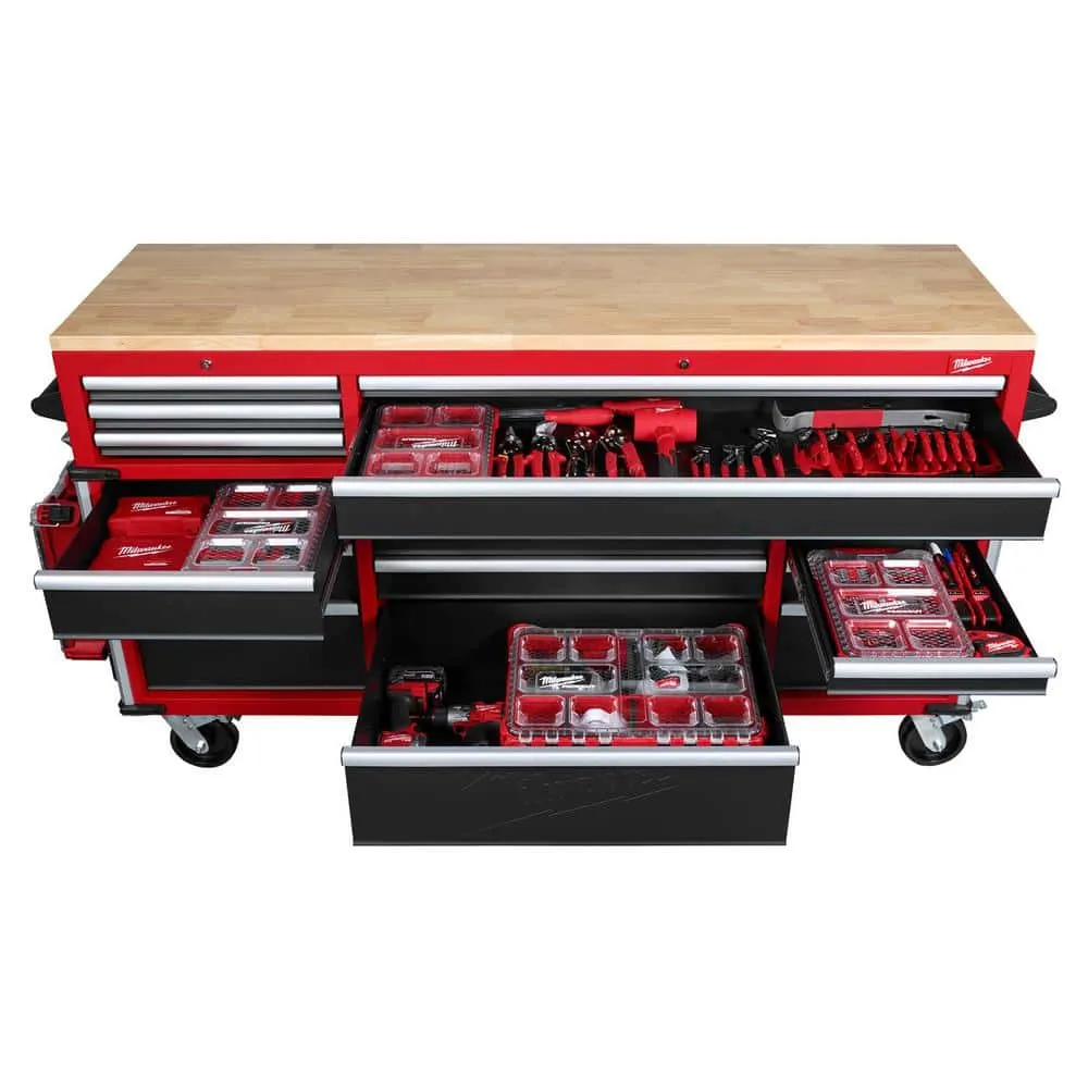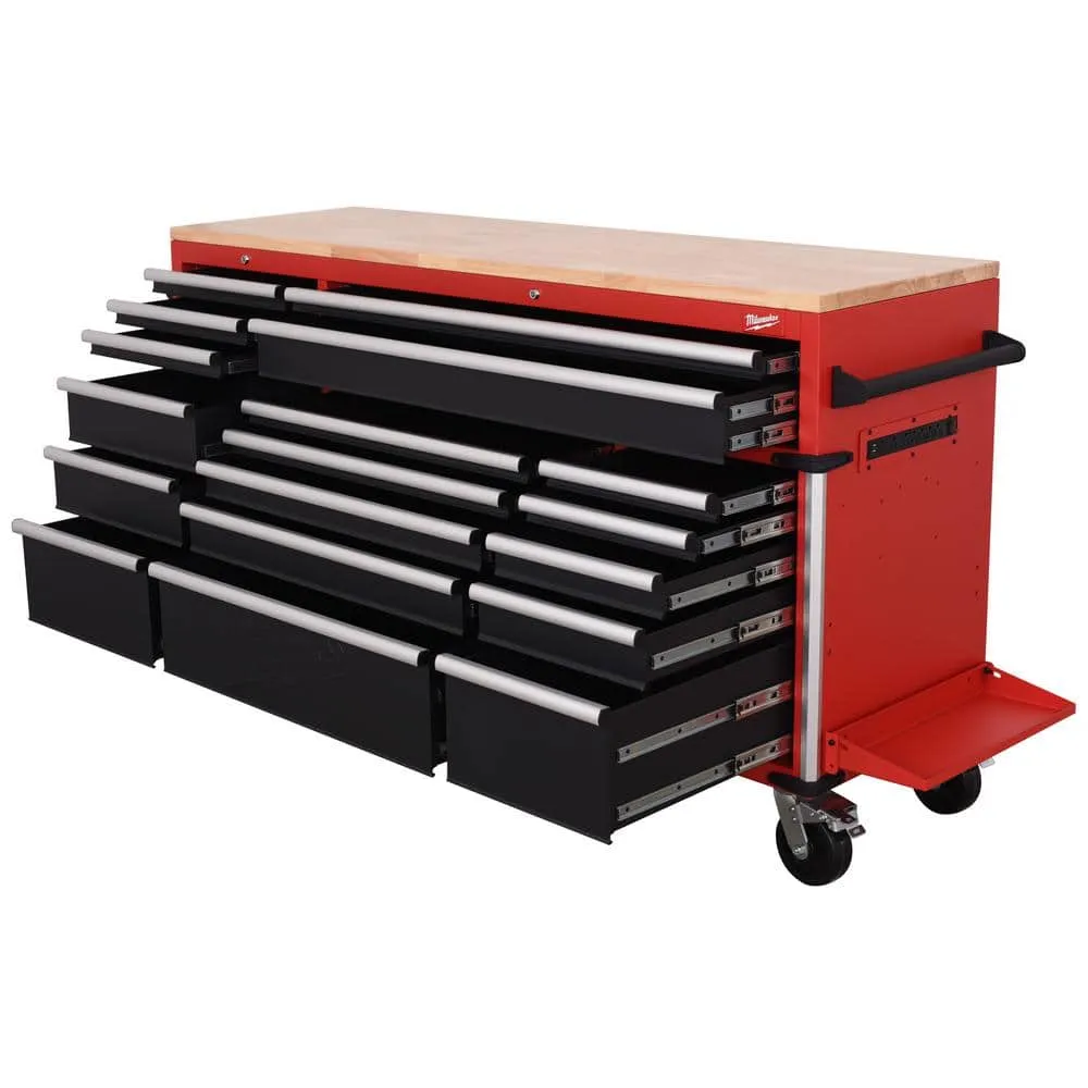 description: The Milwaukee High Capacity 72 in. 18-Drawer Mobile Workbench is the tool storage system you've been waiting for. The base is constructed of 6-gauge angle iron welded to the 18-Gauge cabinet body for superior rigidity and can hold 3,500 lbs. of weight. The expansive work surface is a 1.2 in. thick solid wood top and has a comfortable ergonomic standing height of 42.3 in. The new power drawer feature includes a built-in 4 outlet/2USB power strip for securely powering your battery packs inside the drawer. The 2-piece removable power tool holders allow for custom organization of up to 8 power tools. The 150 lbs. rated, soft-close, ball bearing drawer slides gently retain the drawers from accidental opening or slamming shut. The multi-width/height drawer sizes provide the best utility for storing all sizes of tools and accessories inside the cabinet. The exterior side walls of the workbench have attachment points for installing up to 2 Milwaukee PACKOUT Compact Wall plates per side as well as attachment points for Milwaukee M18 and M12 Multi-Voltage chargers. The side wall mounted 6 outlet/2USB power strip, provides convenient access to power from your work area. Additional features include a 7.5 in. folding side shelf to store your bulk items, a bottle opener and aluminum edge guards with rubber corner bumpers for protection and style. Buy with confidence knowing that you will receive the quality, reliability and durability you expect from the Milwaukee brand.depth: 22.1 inheight: 42.3 inwidth: 72 inweight: 150 lb