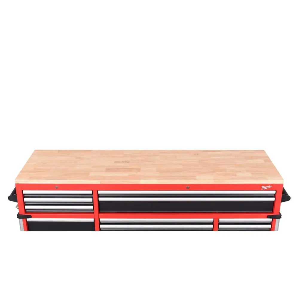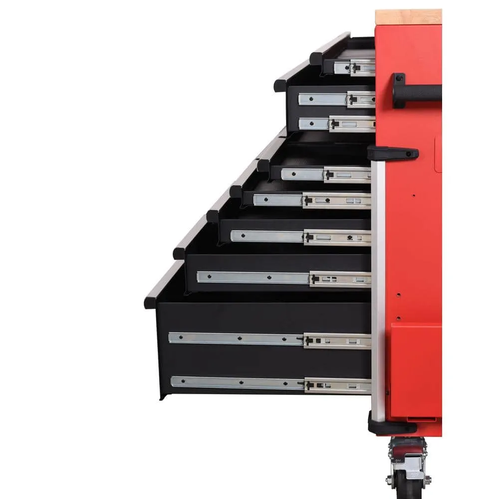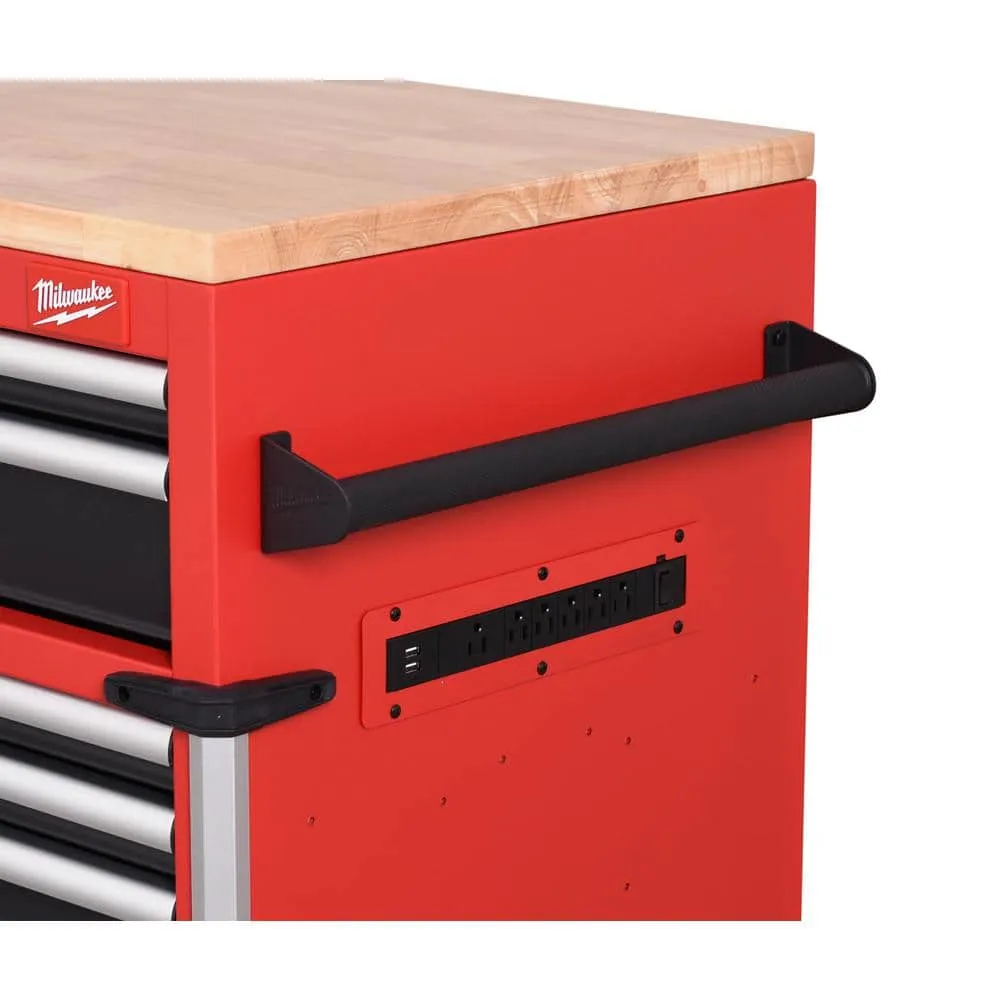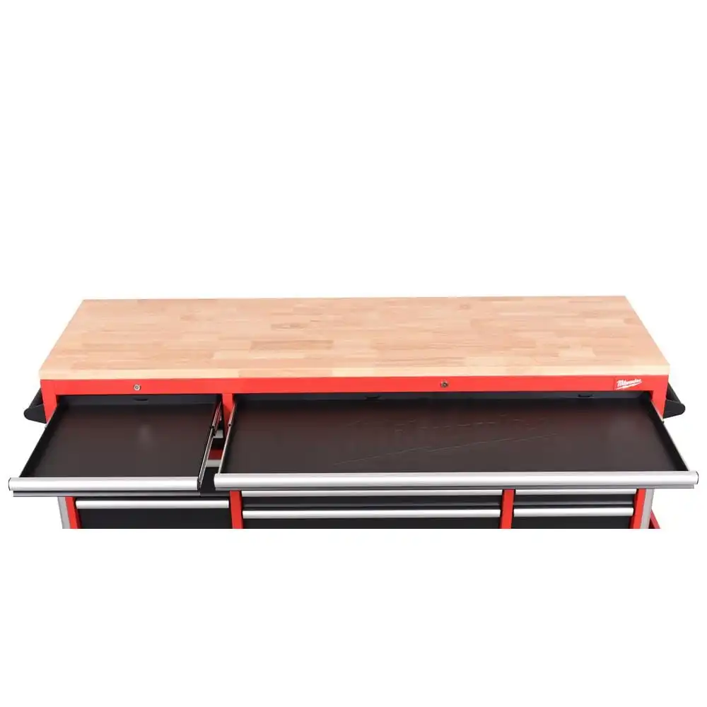 description: The Milwaukee High Capacity 72 in. 18-Drawer Mobile Workbench is the tool storage system you've been waiting for. The base is constructed of 6-gauge angle iron welded to the 18-Gauge cabinet body for superior rigidity and can hold 3,500 lbs. of weight. The expansive work surface is a 1.2 in. thick solid wood top and has a comfortable ergonomic standing height of 42.3 in. The new power drawer feature includes a built-in 4 outlet/2USB power strip for securely powering your battery packs inside the drawer. The 2-piece removable power tool holders allow for custom organization of up to 8 power tools. The 150 lbs. rated, soft-close, ball bearing drawer slides gently retain the drawers from accidental opening or slamming shut. The multi-width/height drawer sizes provide the best utility for storing all sizes of tools and accessories inside the cabinet. The exterior side walls of the workbench have attachment points for installing up to 2 Milwaukee PACKOUT Compact Wall plates per side as well as attachment points for Milwaukee M18 and M12 Multi-Voltage chargers. The side wall mounted 6 outlet/2USB power strip, provides convenient access to power from your work area. Additional features include a 7.5 in. folding side shelf to store your bulk items, a bottle opener and aluminum edge guards with rubber corner bumpers for protection and style. Buy with confidence knowing that you will receive the quality, reliability and durability you expect from the Milwaukee brand.depth: 22.1 inheight: 42.3 inwidth: 72 inweight: 150 lb