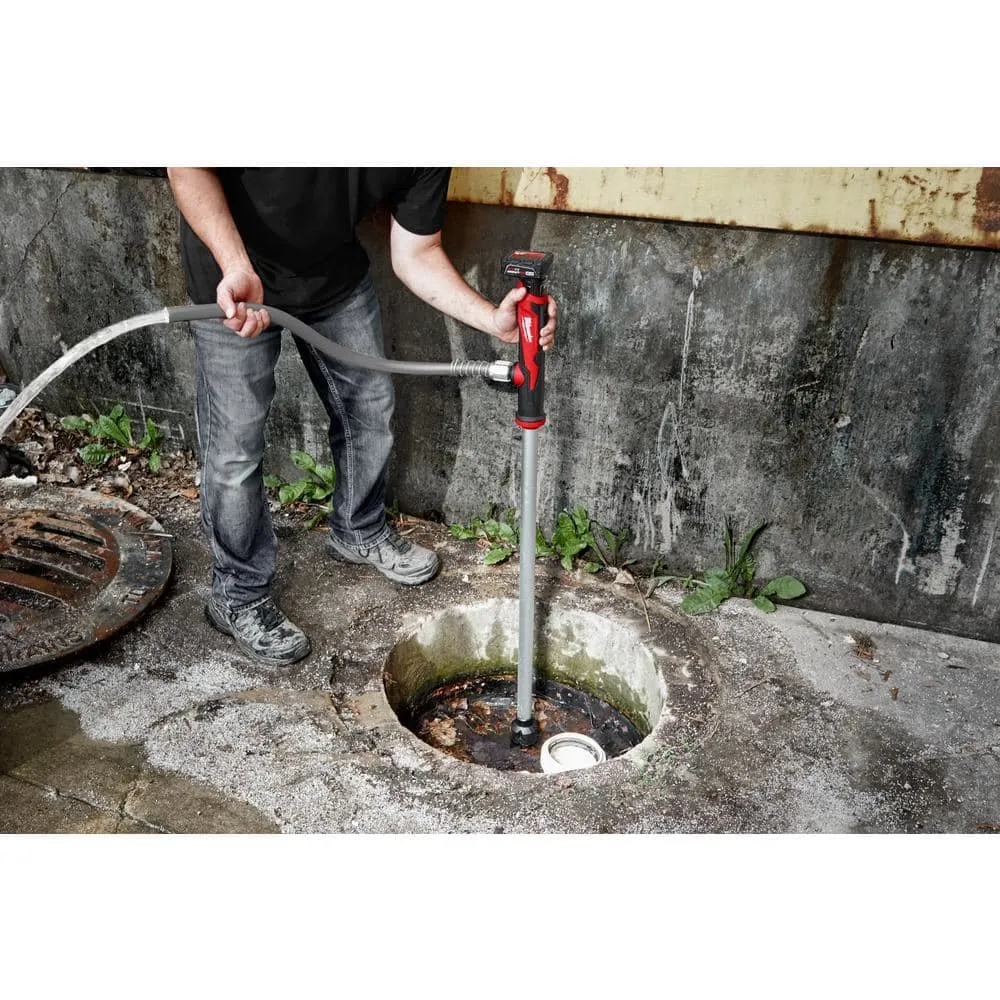 description: Milwaukee M12 stick transfer pump delivers superior filtration for uninterrupted pumping in catch basins, water meter boxes, trenches, sump pump pits, and more. Featuring a 36 in. submersible aluminum barrel, this transfer pump provides the extension needed to reach water at the bottom of trenches and difficult to reach areas. Equipped with HYDRO PASS filter technology, its 360掳 filter maximizes flow in heavy debris, minimizing downtime caused by clogging. Powered by the M12 battery platform, this water transfer pump eliminates repetitive manual pumping and improves control, requiring only one hand to pump, freeing the other to control the outflow. With a 15 ft. maximum head height and an outlet compatible with a standard 3/4 in. garden hose, this pump delivers the power to push water farther out of pits and basins, over walls, and to the ideal deposit location.depth: 3.60 inheight: 48.80 inwidth: 3.60 inweight: 4.20 lb