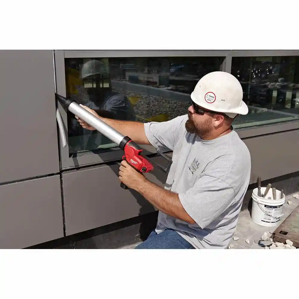 description: Milwaukee includes a 12-Volt lithium-ion battery with this cordless sausage-style caulk gun that will easily dispense over 100 10 oz. tubes on a single charge. The extended barrel also accommodates 20 oz. industrial-size tubes, giving professionals unparalleled efficiency and precision for large-scale adhesive and sealant jobs. Battery life is restored in just 30 minutes with the included M12 charger, short enough to re-energize on your lunch break. Apply precise amounts by setting the speed dial and depressing the variable-speed trigger. Dispensing is aided by a rotating collar and drip-resistant auto-reverse stop.depth: 20.63 inheight: 8.9 inwidth: 4.41 inweight: 7.21 lb