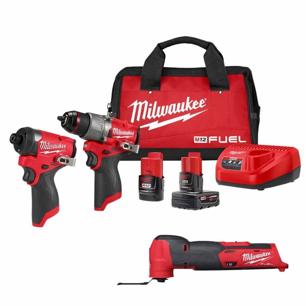 description: Milwaukee M12 FUEL 2-Tool Combo Kit has the Most Powerful Subcompact Drill, the Fastest Driving Subcompact Impact Driver while being the overall Most Compact Drill and Impact Driver. Includes Milwaukee M12 FUEL 1/2 in. Drill Driver, M12 FUEL 1/4 in. Hex Impact Driver, M12 REDLITHIUM XC 4.0Ah Battery Pack, M12 REDLITHIUM CP 2.0Ah Battery Pack, with an M12 charger and a contractor bag. The M12 FUEL 1/2 in. Drill/Driver is the Most Powerful Subcompact Drill Driver, the most compact in size and has the fastest speed under load. The POWERSTATE brushless motor delivers the most power on the widest variety of applications. The portable drill is the shortest solution in its class offering maneuverability and access to tight spaces. Milwaukee REDLINK PLUS Intelligence delivers top of the line thermal performance to give users the Fastest Speed Under Load. Milwaukee M12 FUEL 1/4 in. Hex Impact Driver is the Fastest Subcompact Impact Driver, the Most Compact and provides Maximum Workspace Visibility. The Milwaukee M12 FUEL Oscillating Multi-Tool generates the fastest 12V cut speed, lowest full-tool vibration and delivers tool-free blade change for faster accessory changes and no misplaced tools. The POWERSTATE Brushless Motor delivers 10,000 to 20,000 OPM while maintaining its speed under load better than the competition to provide the fastest cuts of any 12-Volt competitor. The vibration isolating tool design minimizes vibration making their cuts more comfortable with less fatigue.