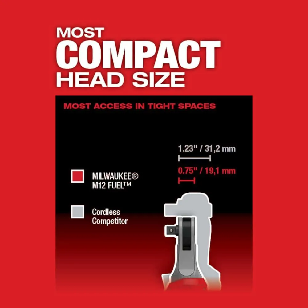 description: The M12 FUEL High Speed Ratchets are Milwaukee's latest addition to their best-in-class lineup of ratchets. These ratchets feature the fastest speeds while installing and removing fasteners. The most compact head size in its class gives users the greatest access in tight spaces. A steel yoke housing and POWERSTATE Brushless Motor deliver the superior durability that users expect from Milwaukee. The M12 FUEL High Speed Ratchets are an ideal addition to any technician's tool chest, allowing users to be more productive than any other cordless ratchet.depth: 10.3 inheight: .75 inwidth: 1.54 inweight: 1.7 lb