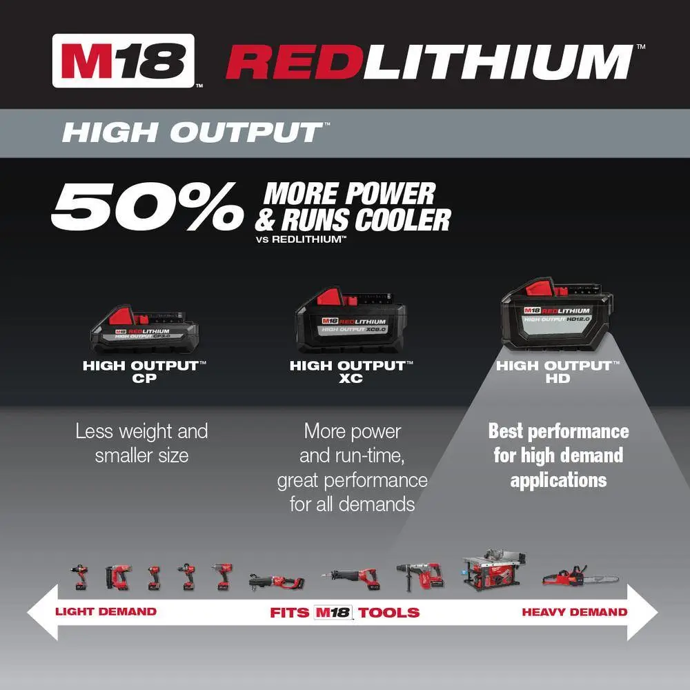 Milwaukee m18 redlithium high output xc8.0 battery pack provides 50% more power and runs 50% cooler versus m18 redlithium xc battery packs. Optimized combination of smaller size and increased power provides a great solution. M18 xc8.0 battery provides increased power in extreme cold wear conditions (below 0°f/minus 18°c) and delivers more work per charge, driving corded replacement. Redlithium high output xc8.0 extended capacity battery is fully compatible with all 200 plusMilwaukee m18 solutions.
