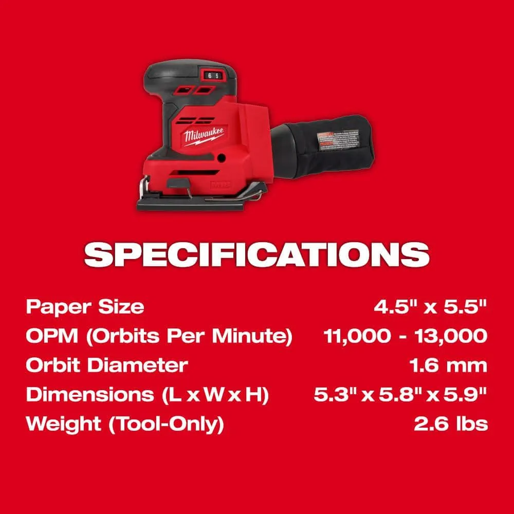 description: Designed for the professional carpenter, remodeler and general contractor, The Milwaukee M18 Orbital 1/4-Sheet Sander is optimized for performance and productivity on the jobsite. The Milwaukee M18 Orbital 1/4-Sheet Sander offers unmatched power at 13K Max OPM and class-leading dust collection to replace your corded unit. The low vibration and ergonomics of the tool deliver enhanced comfort and user control to reduce fatigue. The 2-step clamp system allows for quick and easy sandpaper changes. The variable speed dial offers adjustment from 13K to 11K OPM for precise removal throughout a wide variety of materials. The dust collection system paired with Milwaukee Tool's durable dust bag or universal hose adapter reduces clean-up time and provides a cleaner work environment.depth: 5.2 inheight: 5.9 inwidth: 5.6 inweight: 2.5 lb