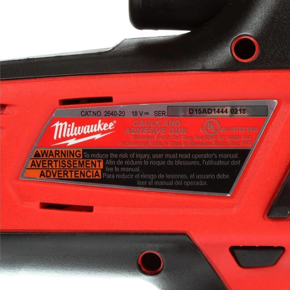description: The most powerful cordless caulk and adhesive gun on the market offers the most bead control. Deliver caulk or adhesives smoothly and steadily, even with the highest viscosity materials, with the incredible pushing force of the Milwaukee M18 Cordless 10-oz Caulk and Adhesive Gun. All-metal gears provide an industry-leading 950 lbs. of force, and CFT Constant Flow Technology eliminates motor oscillation for steady dispensing and even beads at all viscosity levels. A variable-speed trigger and six-setting maximum speed dial optimize the tool's 0 in. to 21 in. per minute (IPM) flow rate. The exclusive Milwaukee anti-drip mechanism prevents the oozing of excess material when the trigger is released. A rotating collar gives you maximum bead control around turns, and the quick-change carriage design lets you change between 10-oz, quart, and sausage-style containers. The adhesive gun comes with a 10 oz. carriage, 10 oz. plunger rod, and piston assembly. This kit comes complete with the Milwaukee M18 REDLITHIUM CP2.0 Battery. The Milwaukee M18 REDLITHIUM CP2.0 Battery delivers up to 2X more runtime, 20% more power, and 2X more recharges than standard lithium-ion batteries. The lithium-ion battery pack features superior pack construction, electronics, and performance giving you more work per charge and more work over pack life than any battery on the market.depth: 3.54 inheight: 10.71 inwidth: 19.8 inweight: 4.9 lb