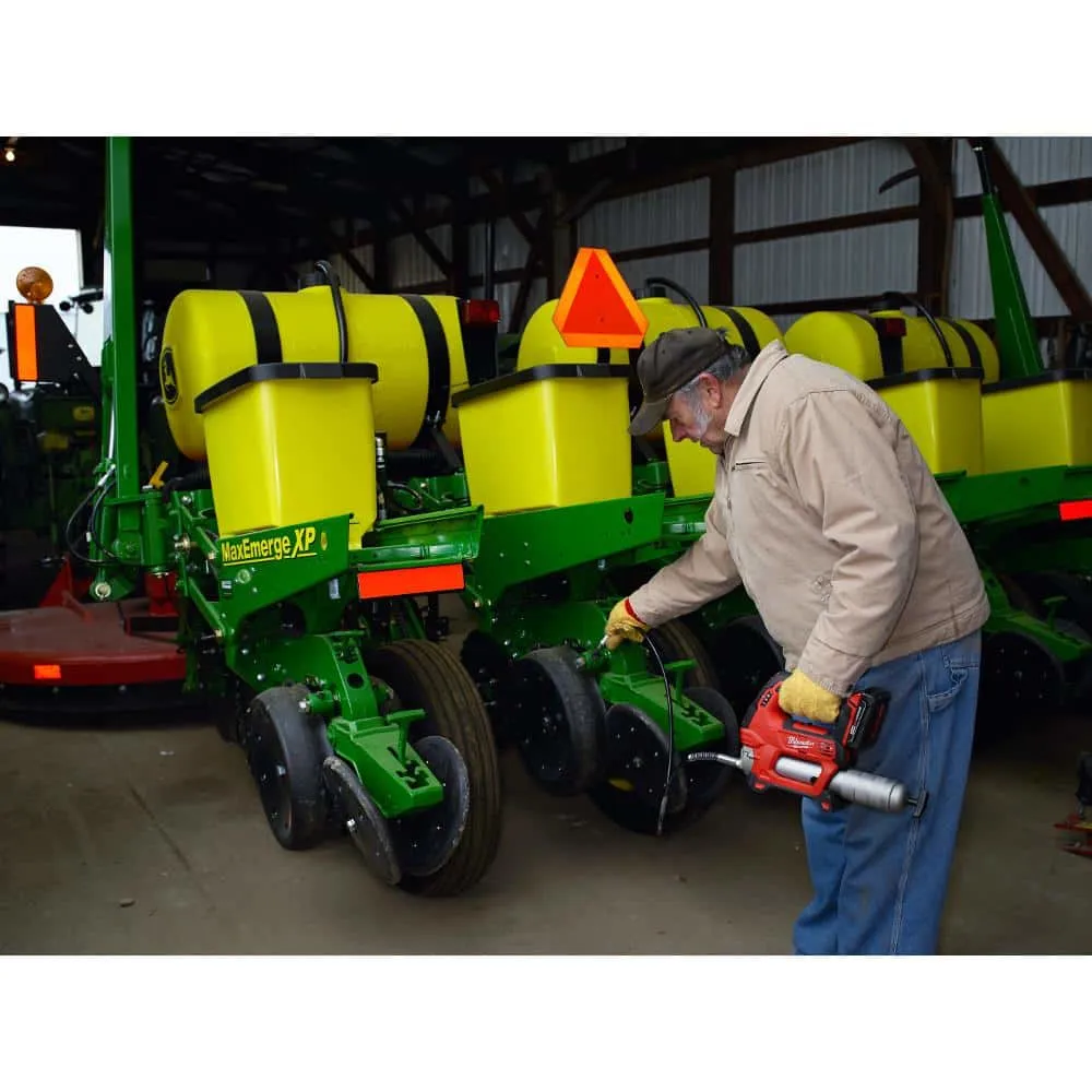 description: The Milwaukee M18 Cordless 2-Speed Grease Gun Kit (2646-21CT) delivers maximum pressure and unmatched versatility, offering 10,000 PSI max operating pressure and a patent-pending, pre-set grease counter that allows service and maintenance professionals to dispense precise amounts of grease. Other unique features include an onboard LED light, lock-on/lock-off trigger and a plunger rod with markings to gauge how much grease is left in the barrel. The tool's stand-up design and shoulder strap capability offer additional convenience while limiting fatigue, and the 48 in. flexible hose offers greater accessibility when greasing hard-to-reach fittings. Powered by an M18 REDLITHIUM battery pack, the kit includes a multi-voltage charger that is conveniently compatible with all M12 and M18 lithium-ion batteries.depth: 5.9 inheight: 14 inwidth: 25.50 in