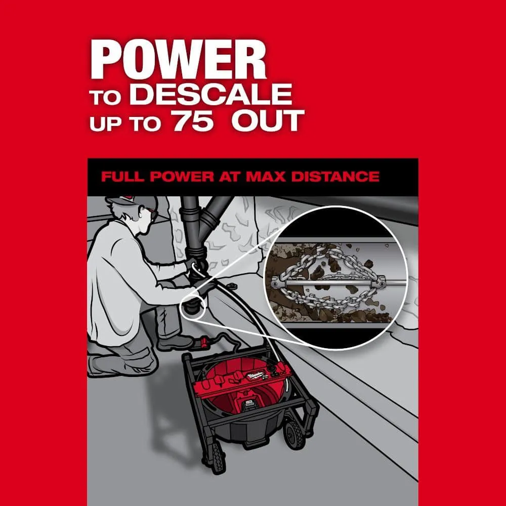 description: The MILWAUKEE? M18 FUEL? High Speed Chain Snake for 1-1/2鈥?鈥?4鈥?Pipes delivers the power to descale, with instant setup. The M18 FUEL? Chain Snake provides the power to descale up to 75鈥?out delivering full power at max distance. The Chain Snake delivers the easiest, most controlled wall-to-wall clean, featuring an infinite variable speed, an electronic foot pedal, and a mechanical clutch. Eliminate the hassle of extension cords, finding electrical outlets, and unreliable drill connections, the Chain Snake provides access to power anywhere. The included (2) M18? REDLITHIUM? High Output? HD 12.0 Battery Packs allow the tool to clear 150鈥?of scale build-up per charge. The M18 FUEL? High Speed Chain Snake comes with 1-1/2鈥? 2鈥? 3鈥? and 4鈥?standard chain knockers to clear grease and soft blockages. Additional accessories available: 1-1/2鈥?Carbide (48-53-3024), 2鈥?Carbide (48-53-3025), 3鈥?Carbide (48-53-3026), 4鈥?Carbide (48-53-3027), Grease Penetrating Head (48-53-3028).depth: 24.5 inheight: 28 inwidth: 17.25 inweight: 17.25 lb