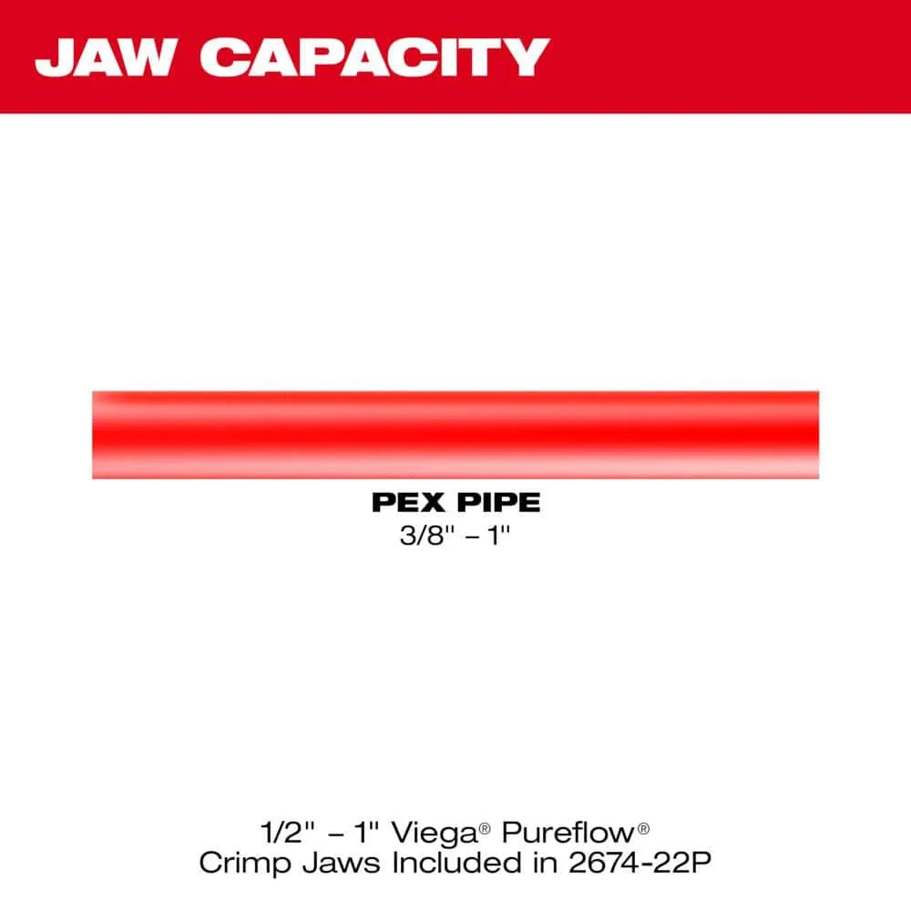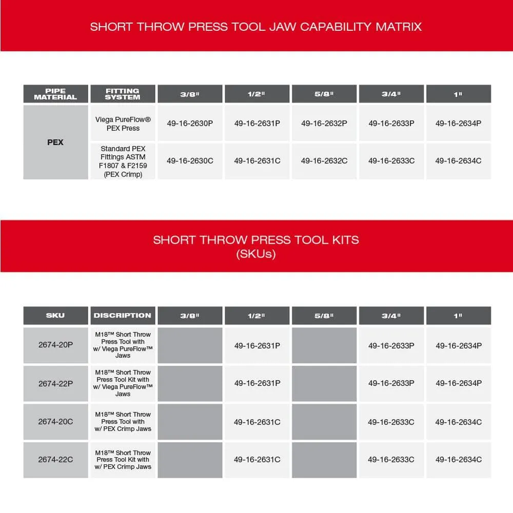 description: The MILWAUKEE M18 Short Throw Press Tool with Viega PureFlow Jaws is the fastest press tool on the market, pressing 40% faster than the competition providing the fastest, effortless installs from branch to fixture. The press tool is designed for one-handed use and is an easy-to-use solution compared to hand tools. Spring-loaded jaws grip the ring for precise alignment on the fitting, while Auto Cycle ensures a full press every time delivering the added assurance of quality connections. The plumbing press tool provides force optimized for residential installs and eliminates the downtime caused by calibration intervals, reducing cost of ownership, and maximizing productivity for the residential installer. The cordless press tool is powered by Milwaukee's M18 REDLITHIUM battery, allowing users to Cut, Fasten, and Connect on One System. This kit includes two M18 REDLITHIUM CP2.0 battery packs, 1/2 in., 3/4 in. and 1 in. Viega PureFlow jaws, an M18 and M12 Multi-Voltage Charger, and a carrying case.depth: 3 inheight: 13.5 inwidth: 3.8 inweight: 4.8 lb