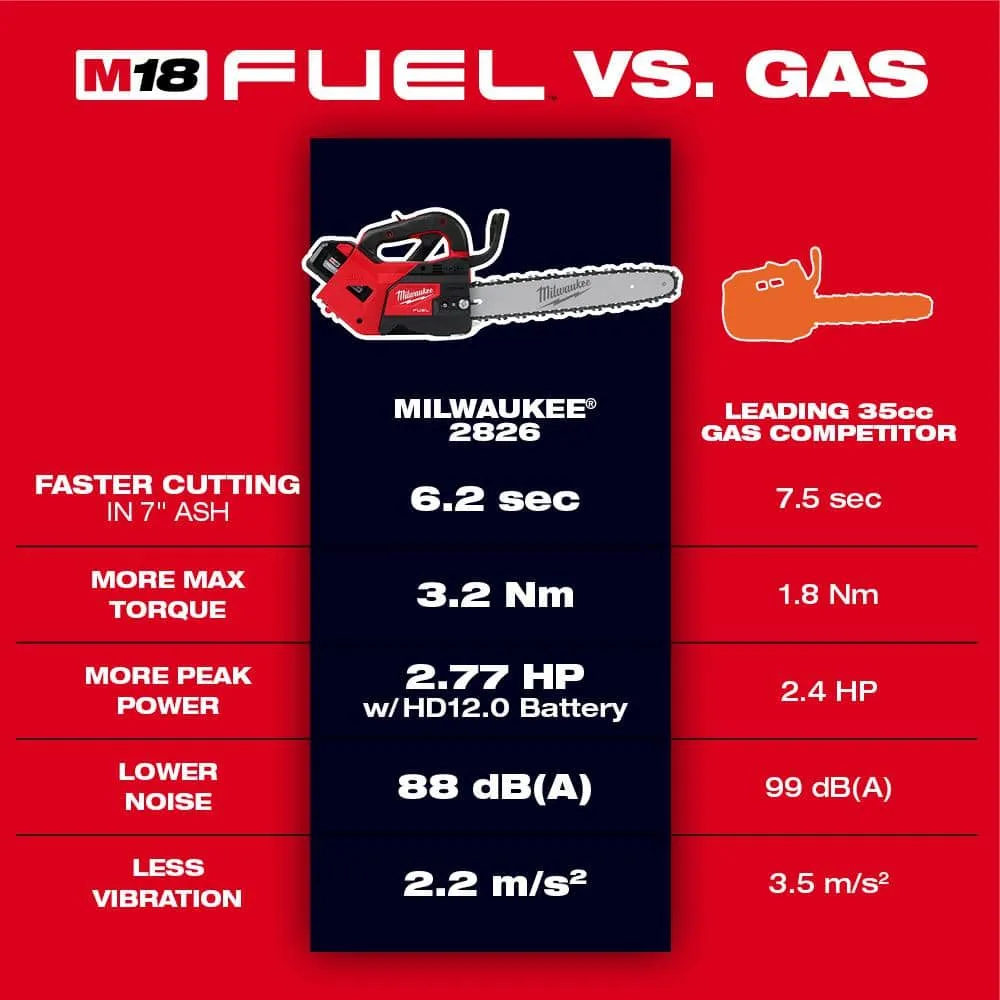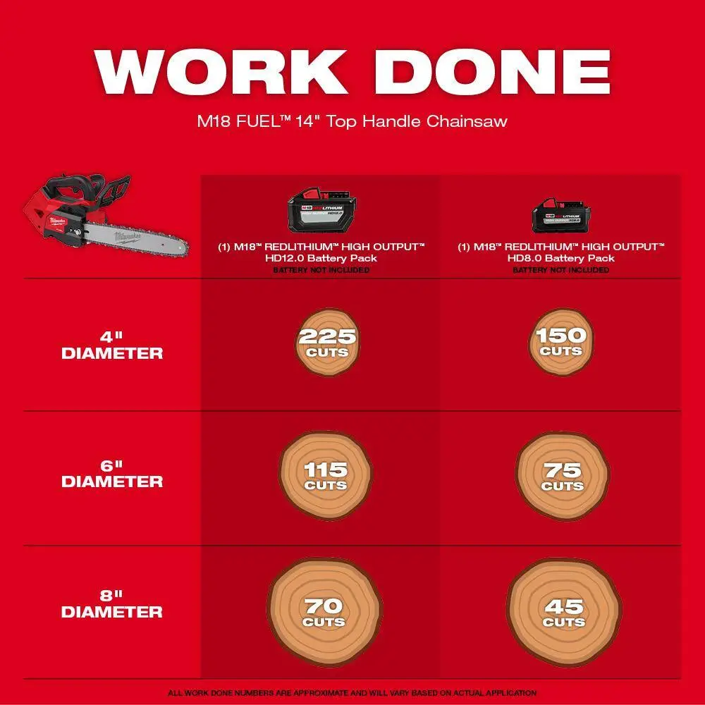 description: The Milwaukee M18 FUEL 14 in. Top Handle Chainsaw cuts faster than 35cc gas, delivers the power to cut hardwoods and eliminates the headaches associated with gas engines. The saw is designed to meet the performance, durability and ergonomic needs of the professional arborist, power utility linemen and landscape maintenance professional. M18 FUEL technology allows the saw to reach full throttle in under 1 second providing ultimate control and cut faster than 35cc gas for increased productivity. The POWERSTATE Brushless Motor maintains speed under heavy loads without bogging down to outperform small gas engines and higher voltage systems. In addition to outperforming gas competitors, the saw eliminates all of the headaches associated with gas engines, such as pull starts, high noise levels, emissions and regular maintenance. The REDLINK PLUS Intelligence enables full-circle communication between the tool and battery, providing you with unmatched levels of performance, protection and productivity. The M18 REDLITHIUM HIGH OUTPUT XC 8.0 Battery (not included) provides efficient power delivery giving you more runtime in application with the ability to make 150 cuts per charge in 4 in. x4 in. Cedar. The saw has a professionally demanded feature set including an easy access chain tensioner, automatic oiler, metal bucking spikes, onboard scrench storage, lanyard loop and climbing scabbard. The M18 FUEL 14 in. Top Handle Chainsaw is compatible with 250+ solutions on the M18 system.weight: 8.2 lb