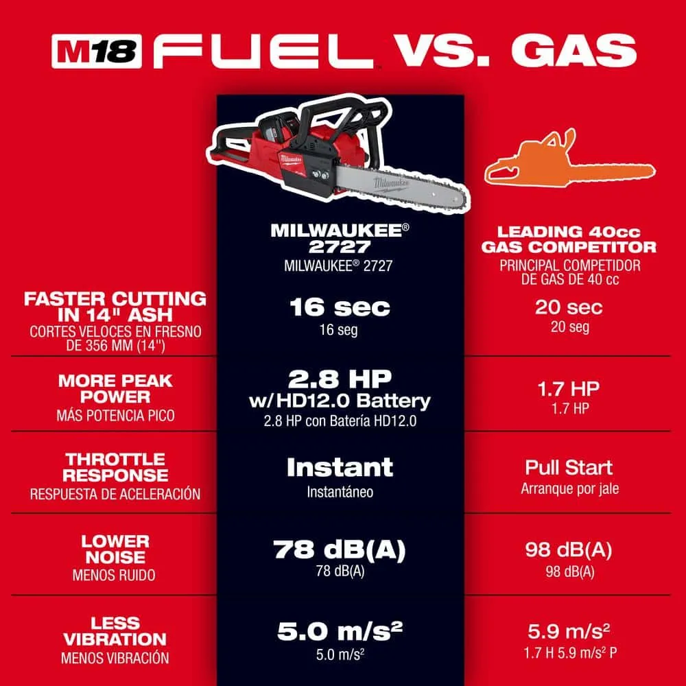description: The Milwaukee M18 FUEL 16 in. cordless chainsaw delivers the power to cut hardwoods, cuts faster than gas-powered models and delivers up to 150 cuts per charge. The battery powered chainsaw is designed to meet the performance, durability and ergonomic needs of professional landscape maintenance, power utility and the installed M18 users. M18 FUEL technology allows the unit to reach full throttle in under 1 second providing the ultimate control and productivity. The POWERSTATE Brushless Motor was purposely built for the M18 FUEL 16 in. Chainsaw to provide the power and performance of a gas engine up to 40 cc. Built-in REDLINK PLUS Intelligence ensures optimal tool performance and provides overload protection to prevent damage to the tool and battery during heavy applications while still maintaining compatibility across the entire M18 System. The REDLITHIUM High Output HD12.0 Battery Pack provides 50% more power and runs 50% cooler versus standard REDLITHIUM HD packs. Superior pack construction provides the industry's best protection against jobsite weather and environmental conditions. In addition to the chainsaw, this kit comes with one M18 REDLITHIUM High Output HD12.0 battery pack (48-11-1812), one M18/M12 multi-volt rapid charger (48-59-1808), one 16 in. Oregon bar and chain and 1 scrench.weight: 13.9 lb