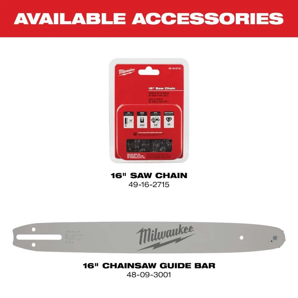 description: The Milwaukee M18 FUEL 16 in. Chainsaw delivers the power to cut hardwoods, cuts faster than gas, and delivers up to 150 cuts per charge. The unit is designed to meet the performance, durability and ergonomic needs of professional landscape maintenance and power utility. The POWERSTATE Brushless Motor maintains speed under heavy loads without bogging down to outperform small gas engines and higher voltage systems. REDLINK PLUS intelligence ensures maximum performance and protection from overload, overheating and over discharge. When paired with the M18 REDLITHIUM HIGH OUTPUT HD 12.0 battery, the unit delivers unmatched run-time in all applications. M18 FUEL technology allows the unit to reach full throttle in under 1-second providing ultimate control and productivity.weight: 10.7 lb
