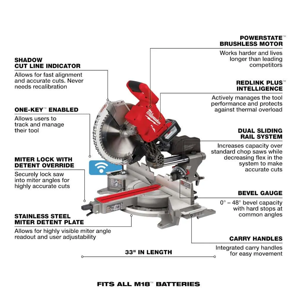 description: The MILWAUKEE M18 FUEL 12 in. Dual Bevel Sliding Compound Miter Saw with ONE-KEY Kit generates the power of 15 Amp corded saws and is designed for the professional carpenter, remodeler and general contractor. The miter saw is up to 15% lighter than competitor saws and delivers up to 330 cuts per charge. It has the same capacity as corded a 12 in. miter saw, giving users the ability to perform all of their critical applications while increasing their portability, efficiency and productivity on the jobsite. The cordless miter saw features the Milwaukee POWERSTATE Brushless Motor, REDLINK Tool Technology and is powered by M18 REDLITHIUM batteries. The saw has a Shadow Cut Line LED light, an adjustable stainless steel detent plate, cam locking miter system and easy carry side handles, making it a leading miter saw solution. In addition to the saw, this kit includes one M18 REDLITHIUM HIGH OUTPUT HD12.0 battery, an M18 & M12 Rapid Charger, handles and clamp.depth: 33.000 inheight: 17.500 inwidth: 31.50 inweight: 52.40 lb