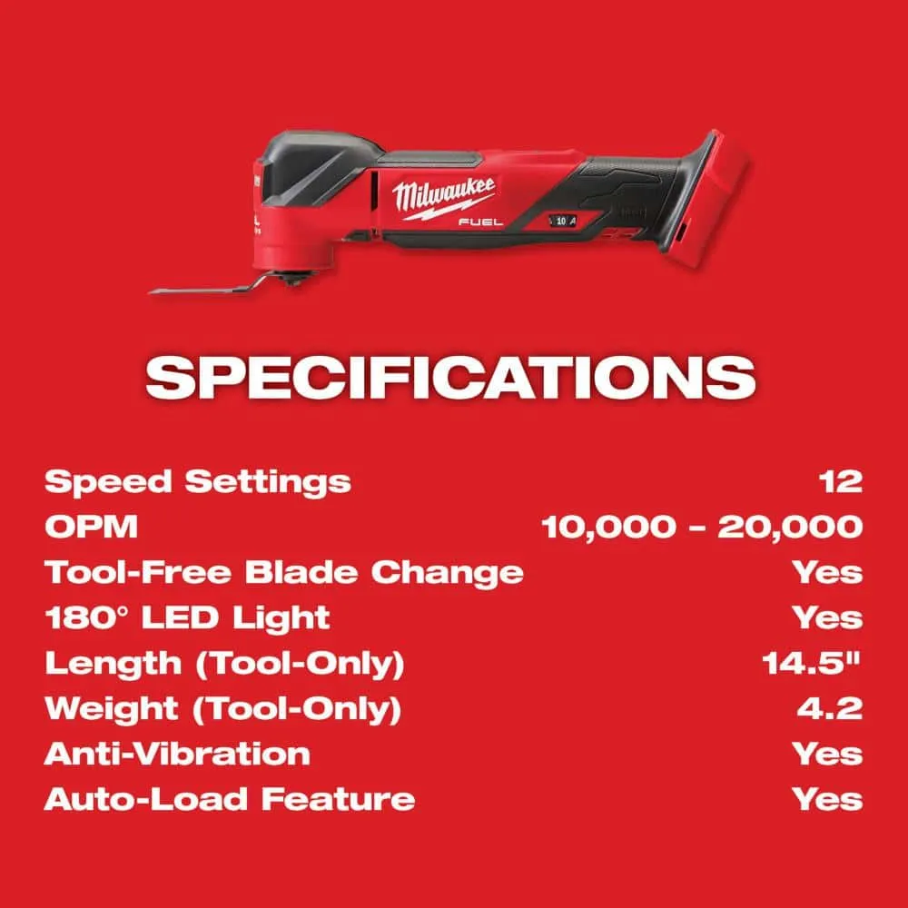 description: The Milwaukee M18 FUEL Oscillating Multi-Tool Kit generates the fastest cuts, the power for demolition and the lowest full tool vibration. The POWERSTATE Brushless Motor delivers 10,000 OPM to 20,000 OPM with an aggressive 4.2掳 oscillation angle to deliver the fastest cuts over the competition. The cordless multi-tool also gives users the power to complete many demanding applications with ease, such as large cuts through hardwoods and nail embedded wood, pushing the limits of what a multi-purpose oscillating tool can do. Vibration dampening technology delivers the lowest full tool vibration, letting users make cuts more comfortably with less fatigue. REDLINK PLUS Intelligence ensures users achieve unmatched levels of performance, protection and compatibility. The M18 REDLITHIUM XC5.0 battery delivers more work per charge than competitive batteries on the market when used with the multitool. The M18 FUEL Oscillating Multi-Tool has a 10-Setting Dial with an additional Auto-Load Feature, allowing users to adjust the speed to the application. An integrated 180-degree LED light provides maximum visibility in low-light situations.depth: 12.17 inheight: 3.89 inwidth: 2.53 inweight: 2.58 lb