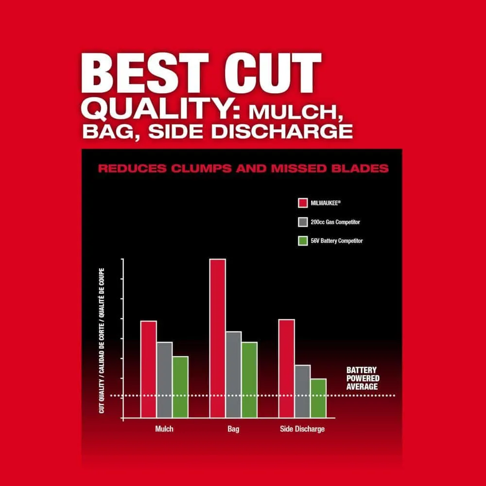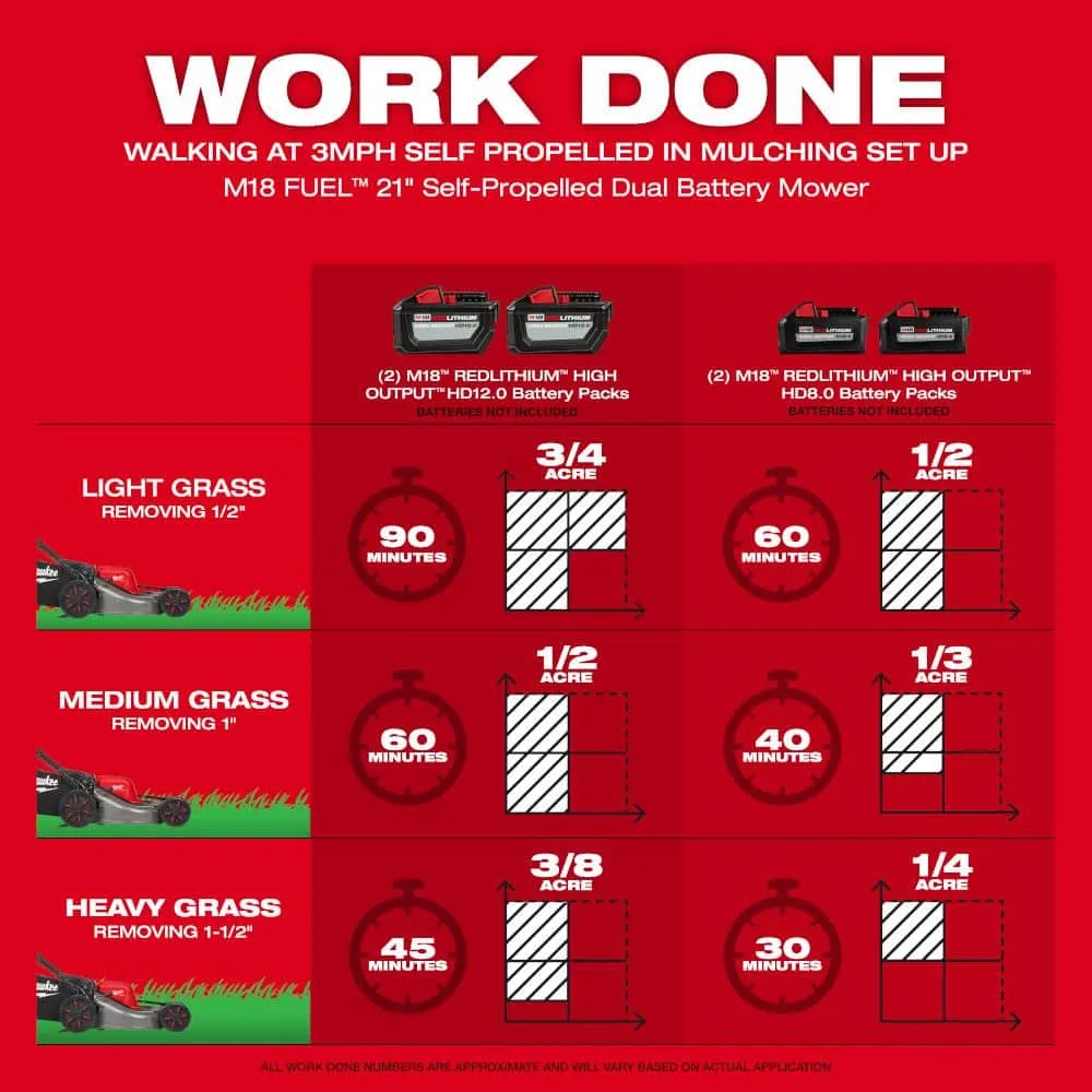 description: The Milwaukee M18 FUEL 21 in. Self-Propelled Dual Battery Mower meets the performance, durability and ergonomic needs of landscape maintenance professionals. The optimized steel deck design and higher blade speed allow the mower to achieve superior airflow and increased lift for the best cut quality in mulching, bagging and side discharge applications. The POWERSTATE Brushless Motor delivers more max torque than 200 cc gas to take on the most demanding mowing applications. The REDLINK PLUS Intelligence has total system communication between the tool and battery for unmatched levels of performance, protection and productivity. The advanced electronic package also delivers an instant throttle response on both the lawn mower blade and drive motors to reach full throttle in under 1-second, which increases user control and productivity. The mower requires 2 M18 REDLITHIUM Batteries for operation. The mower delivers up to 60-minutes of runtime for up to 1/2 acre of cutting when removing 1 in. of grass at a 3 MPH self-propelled pace. The Variable Speed Self-Propelled Mower offers speeds between 0 MPH to 4 MPH and the Active Speed Management Paddles allow users to easily adjust their walking pace while in operation to increase control. The M18 FUEL Mower features a steel deck, 3-in-1 grass management, single point height adjustment, high lift mode, front and side LED lights, vertical storage and 2 deck handles.depth: 64 inheight: 42 inwidth: 22 inweight: 78.20 lb