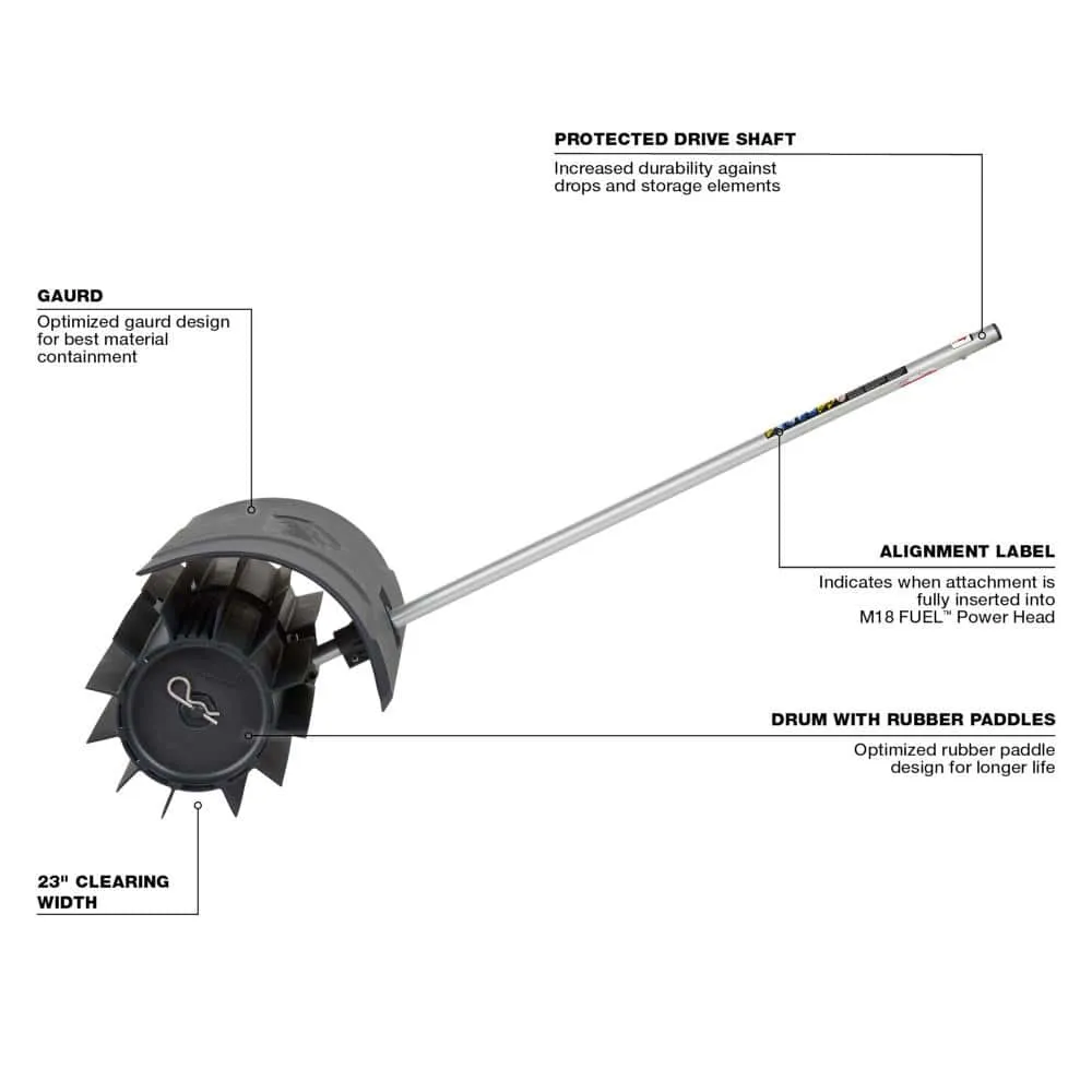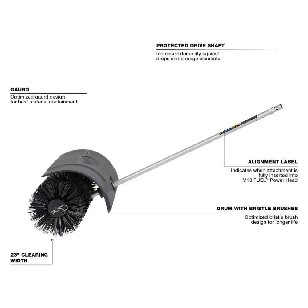 description: The Milwaukee M18 FUEL QUIK-LOK Rubber Broom Attachment is powered by the Milwaukee M18 FUEL Power Head w/ QUIK-LOK and is compatible with the split boom M18 FUEL QUIK-LOK Attachment System. This split shaft attachment's optimized rubber paddle design is great for removing debris like mulch and gravel from grass and allows for longer life while covering a 23 in. clearing width. Milwaukee rubber broom's optimized guard design offers the best material containment. Milwaukee QUIK-LOK Attachments feature protected drive shafts for increased durability against drops and storage elements. The rubber broom attachment also features optimized gearing to manage the cordless Milwaukee M18 FUEL Power Head RPM output specifically for this attachment. The Milwaukee M18 FUEL QUIK-LOK Bristle Brush Attachment is powered by the Milwaukee M18 FUEL Power Head w/ QUIK-LOK and is compatible with the split boom M18 FUEL QUIK-LOK Attachment System. This split shaft attachment's optimized bristle design is great for removing debris like mulch and dirt from hard surfaces and allows for longer life while covering a 23 in. clearing width.depth: 48.75 inheight: 48.75 inwidth: 23.50 in