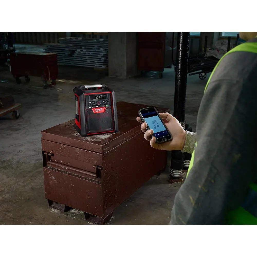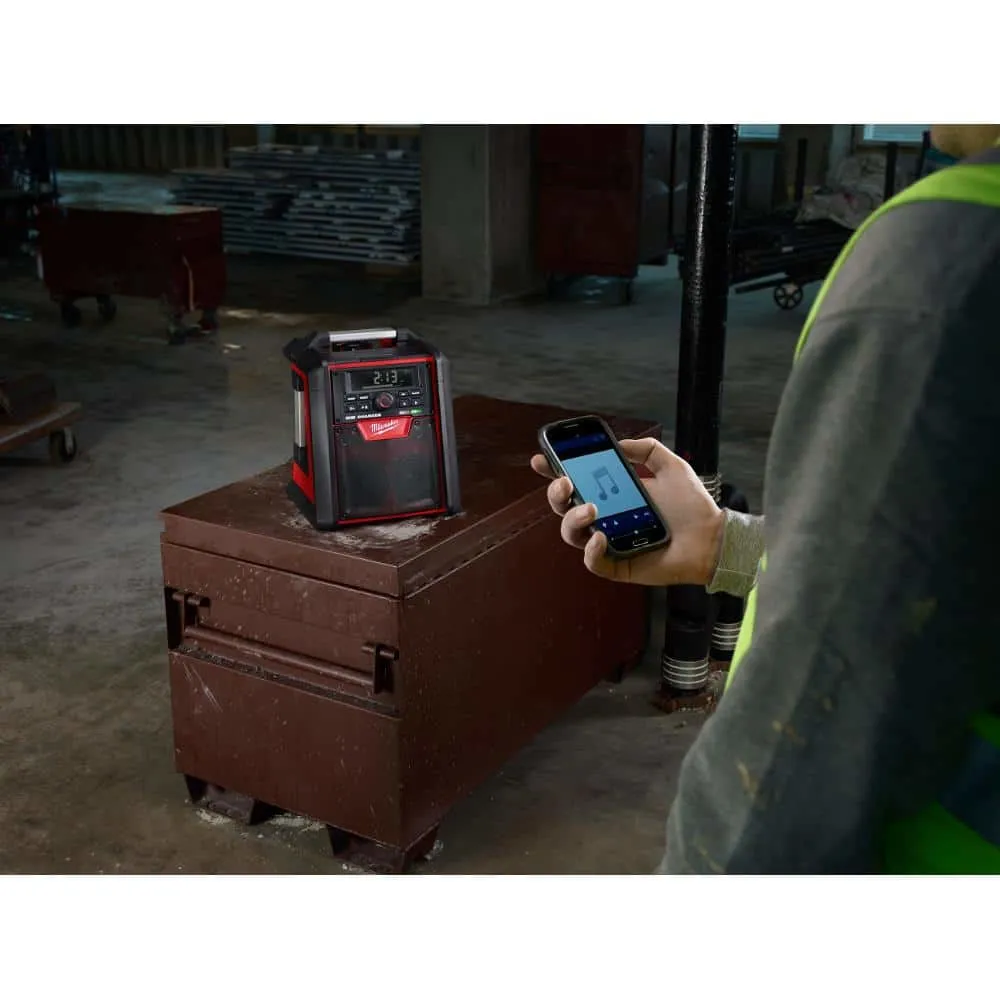 description: The Milwaukee M18 Jobsite Radio/Charger is the first charging radio to bring the power of Bluetooth to the jobsite, while delivering the industry's best reception and sound. The most advanced radio of its kind, the M18 Jobsite Radio/Charger features a Bluetooth receiver so you can stream rich, full sound wirelessly from over 100 ft. away. Its unique battery charger allows you to charge any M18 battery without sacrificing reception or sound quality. For added versatility, a high-power USB port allows you to charge most portable electronic devices over 50% faster than any competitor. The M18 Radio/Charger's lightweight, high-strength design includes a reinforced roll cage for protection from weather and abusive jobsite conditions. The radio/charger also offers the industry's largest on-board, weather-sealed storage compartment to protect your small belongings and smart phones. A 16 in. auxiliary input cord and 2 AAA batteries are included.depth: 12 inheight: 15 inwidth: 12 in