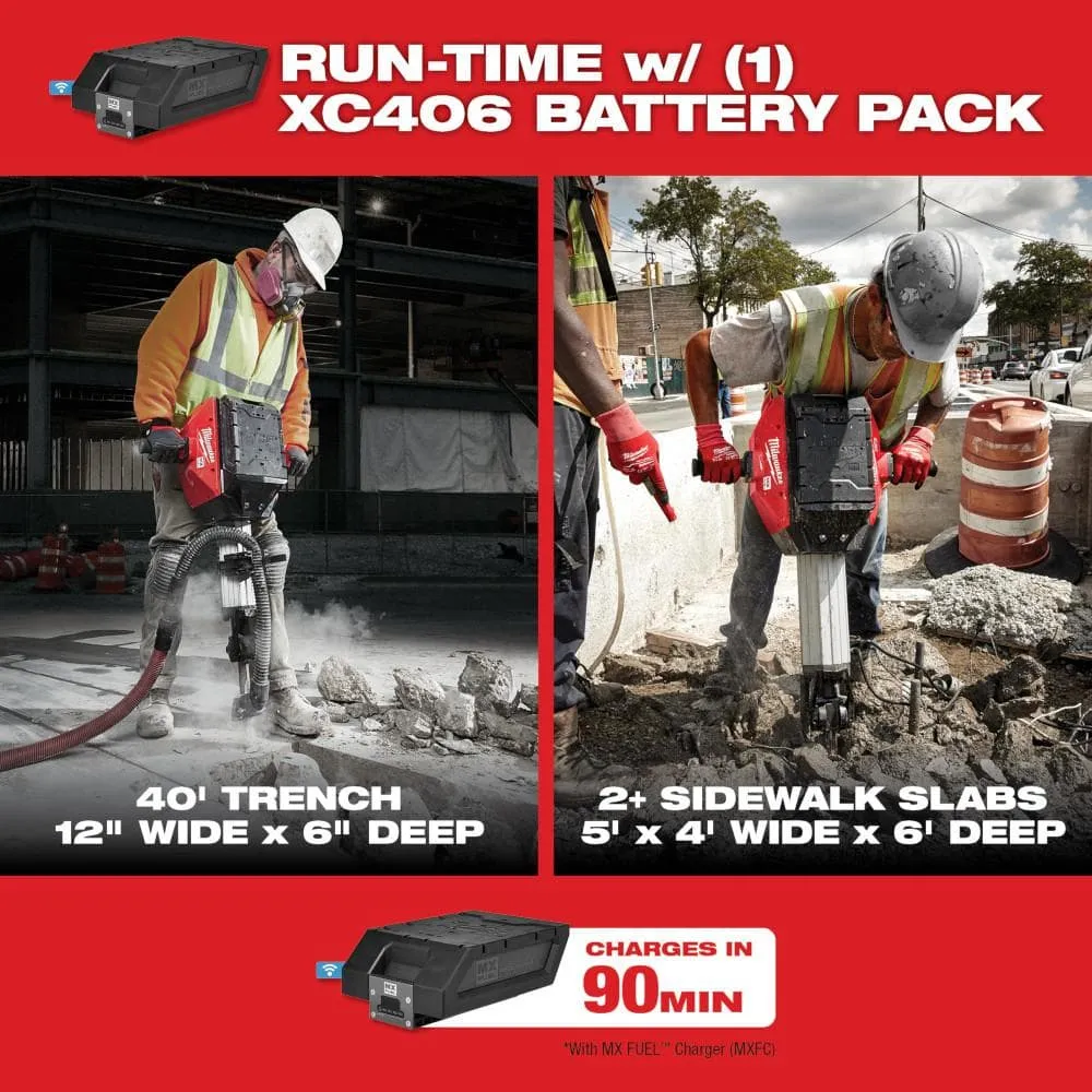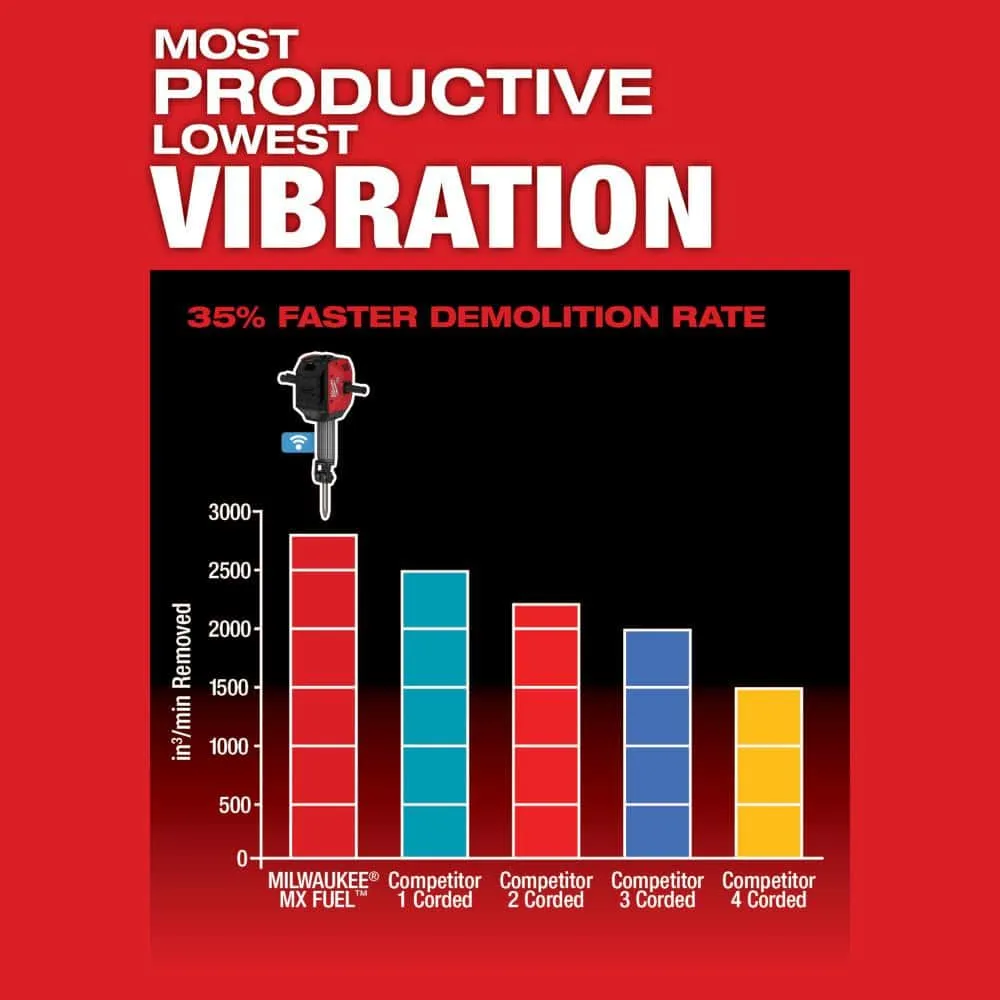 description: The MX FUEL Breaker delivers users a Faster, Safer, Easier Concrete Demolition experience. The MX FUEL Breaker is the Most Productive, Lowest Vibration Breaker on the market delivering and is designed for the professional user, delivering ultimate power, durability and productivity. The Breaker is Lightest in Class, making it easier to handle in all orientations and transport on and off the jobsite. The Breaker can break over 2-Tons per Charge, allowing users to complete extremely demanding applications. The MX FUEL Breaker utilizes a POWERSTATE Brushless Motor to deliver 50 ft./lbs. of impact energy that meets and exceeds that of corded competition. REDLINK PLUS intelligence tool technology ensures maximum performance and protects it from overload, overheating and over discharge. Our MX FUEL REDLITHIUM XC Battery Pack with deliver unparalleled run time and allow users to break a 40 ft. trench that is 1 ft. W and 6 in. thick. The MX FUEL Breaker is also compatible with our integrated ONE KEY Smart Technology which enables wireless tool connectivity to smart devices including smart phones and tablets to easily track and manage a tools performance and its location.depth: 32.2 inheight: 11.6 inwidth: 25.1 inweight: 63.9 lb
