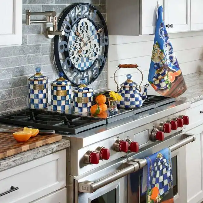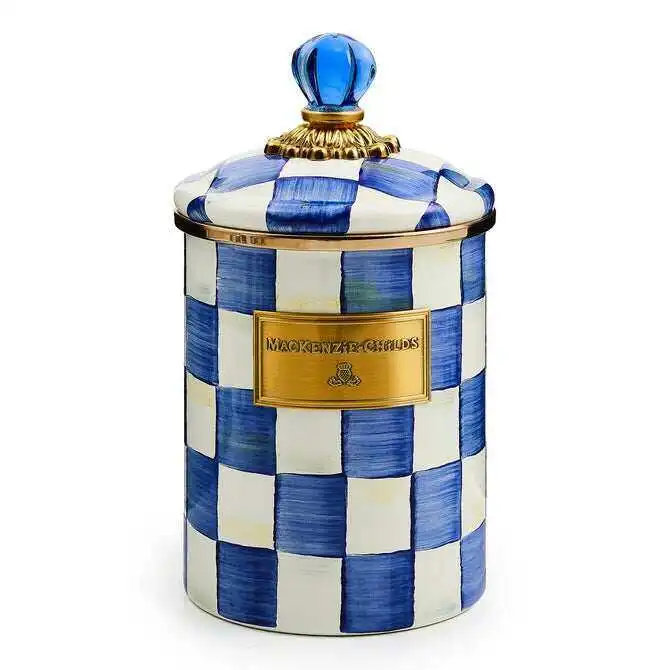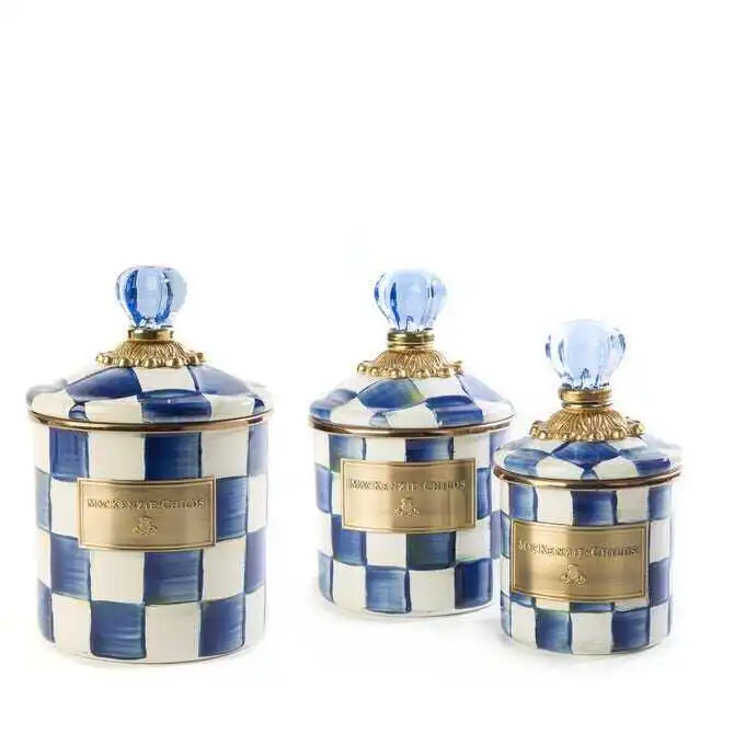 Pantry staples, flour, sugar, and coffee might seem the most obvious of contents with which to fill Royal Check Enamel Canisters, but the possibilities are endless! Keep them in the kitchen with coffee beans and tea bags, cookies and candies, or dog biscuits and birdseed, or invent new uses around the house. Each enameled steel canister is hand-painted with color-dragged checks in a range of blue hues and topped with an elegant blue glass knob. These canisters stand handsomely alone or harmonize delightfully in a set.