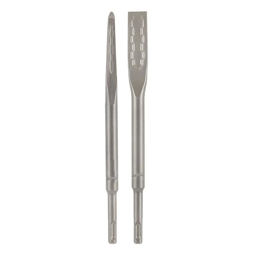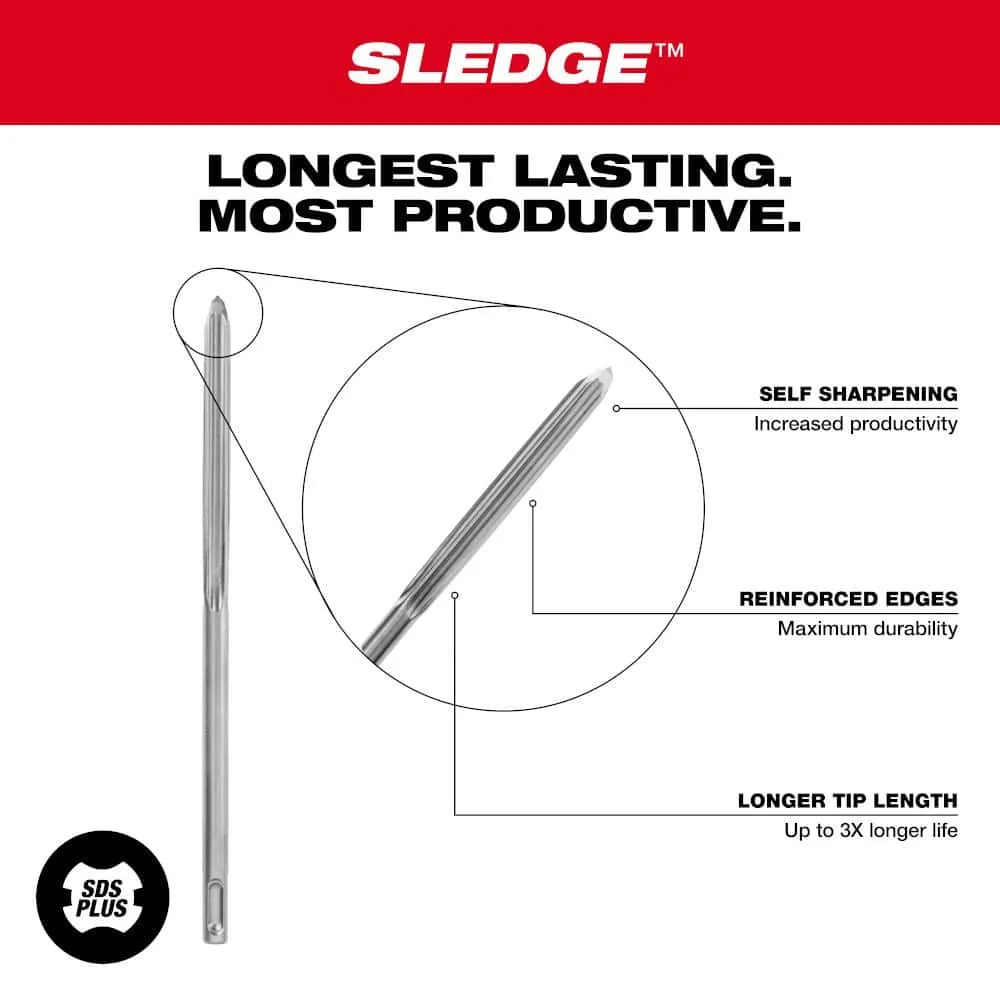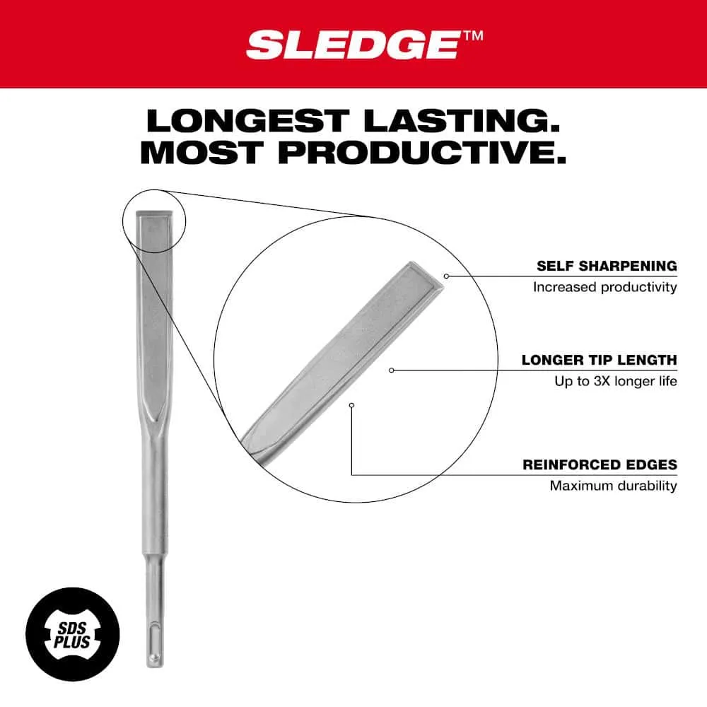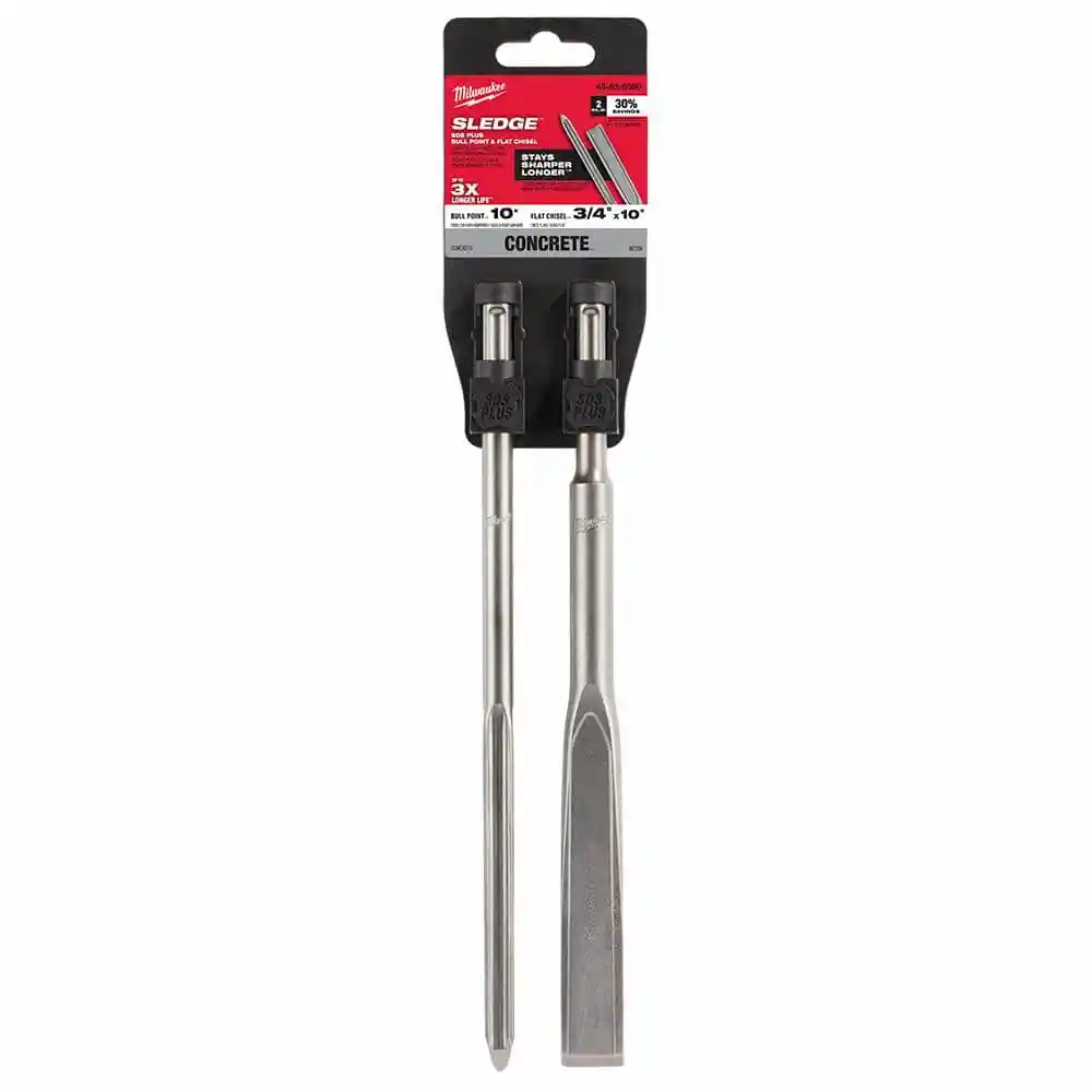 description: The MILWAUKEE? SDS PLUS SLEDGE? Chisels are Milwaukee's Longest Lasting, Most Productive family of chisels. The 2 Pack SDS PLUS SLEDGE? Bull Point & Flat Chisels are forged with high grade steel to deliver maximum durability and reduced wear over the life of the chisels. These SLEDGE? chisels are engineered with reinforced edges to stay sharper longer. They feature longer tip lengths vs. standard chisels for up to 3x longer life. The SLEDGE? Bull Point Chisel is ideal for starting holes, and both chisels are designed for general chipping and breaking concrete. No re-sharpening or re-hardening is necessary, reducing downtime. These MILWAUKEE? SDS PLUS SLEDGE? Bull Point and Flat Chisels are designed for use with SDS PLUS rotary hammers.