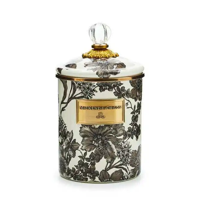 Pantry staples, flour, sugar, and coffee might seem like the most obvious choices with which to fill a Sterling English Garden Enamel Canister, but the possibilities are endless! Keep them in the kitchen with coffee beans and tea bags, cookies and candies, or dog biscuits and birdseed, or invent new uses around the house. Each enameled steel canister is decorated with hand-applied black floral transfers, rimmed in bronzed stainless steel, and topped with an elegant clear glass knob. These canisters stand handsomely alone or harmonize delightfully in a set.